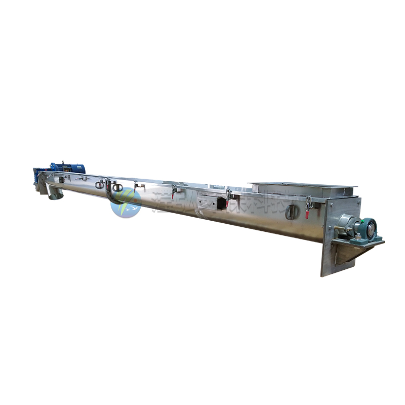 U型螺旋輸送機(jī)采用"U"形機(jī)槽、較低的螺旋裝束及固定安裝的結(jié)構(gòu),U形槽采用分段式法蘭連接,便于更換及維修內(nèi)部襯套。U型螺旋輸送機(jī)適合水平或小傾角輸送,傾斜角度不超過(guò)30°,可單點(diǎn)進(jìn)料或出料,也可多點(diǎn)進(jìn)料或出料,對(duì)于粉塵較大以及對(duì)環(huán)境有要求的場(chǎng)合具有極大的優(yōu)勢(shì)。另外,輸送機(jī)上部加防雨型機(jī)蓋,密封性好,輸送過(guò)程基本屬于密閉式運(yùn)輸,可有效降低室內(nèi)異味外泄或外部灰塵進(jìn)入。