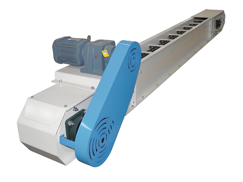 刮板輸送機(jī)是借助牽引構(gòu)件(鏈條)上刮板的推力作用,使散狀物料沿著機(jī)槽移動(dòng),從而輸送物料的連續(xù)式輸送機(jī)。其密閉性能好,物料在封閉的機(jī)槽內(nèi)輸送,不拋撒、不泄露、能防塵、防水、防毒、防爆,大大改善了工作環(huán)境,防止環(huán)境污染,可實(shí)現(xiàn)多點(diǎn)加料或多點(diǎn)卸料,輸送過(guò)程中物料與刮板鏈條之間基本上無(wú)相對(duì)運(yùn)動(dòng),故對(duì)物料的損傷較小。